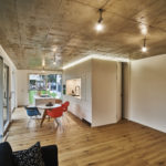 Die Wohnungsinnenwände bestehen aus einer beidseitig mit Gipskartonplatten beplankten Metallständerwand, die den brandschutztechnischen Anforderungen entsprechen. Die Innenwände wurden mit weißer Farbe bemalt, die Decken wurden gezielt stellenweise in Sichtbetonoptik ausgeführt, um den architektonischen Entwurf zu ergänzen.