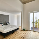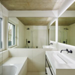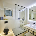 In den Sanitärbereichen wurden italienische Armaturen und Waschtische sowie LED-Spiegel verbaut. Die Hänge-WCs wurden in schwarz-matter Optik mit verbauten Drückspülungen der Marke Geberit angebracht, ebenso schwarz-matt.