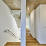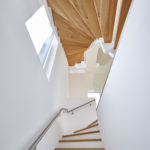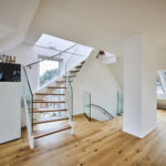 Die Wohnungsstiegen wurden in Stahlbeton ausgeführt und mit Parkettauftritten (siehe oben, Eiche Country-Parkettboden) und Edelstahlhandläufen ausgestattet. An der Unterseite wurde bewusst die Sichtbetonoptik beibehalten und an den Setztreppen weiß verputzt. Die Treppen der Tops 2 und 4, die zu den Dachterrassen führen sind Wangenstiegen mit weiß bemalten Wangen und Echtholztrittstufen (siehe oben, Eiche Country-Parkettboden) sowie Nurglasgeländern.